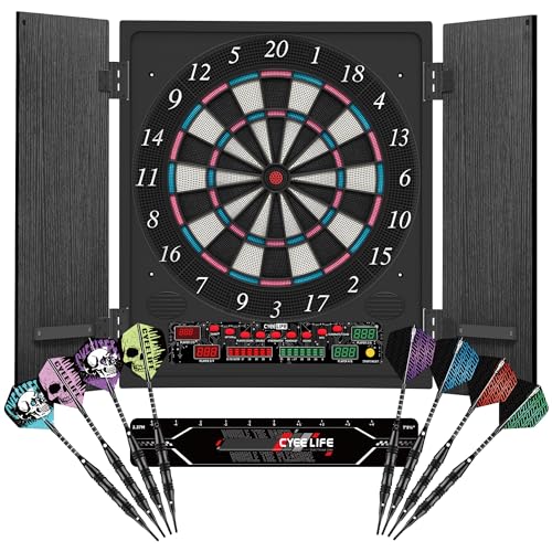CyeeLife Cible de Fléchettes Électronique avec Meuble en Bois, Machine à Fléchettes Électronique, Cible avec 34 Jeux et 355 Variantes, Mode 8 Joueurs (Noir-2, Standard)