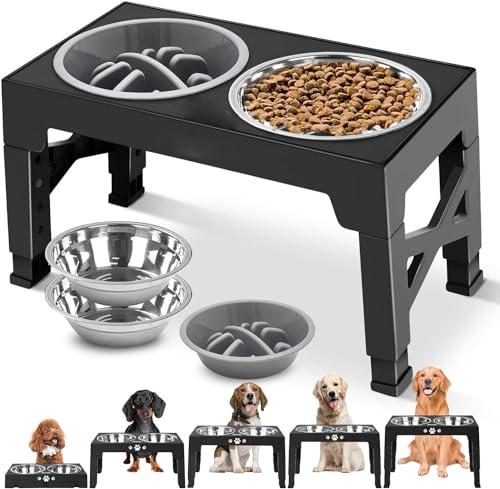 3PCS Comedero para Perro(Stainless steel bowl*2+Plato para Alimentación Lenta*1), Cuenco Elevado para Perros,Soporte Elevado para Cuencospara Perros y Mascotas pequeños, medianos y Grandes(Negro)