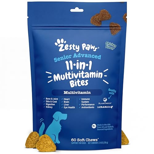 Zesty Paws Senior Dog Multivitamin Treats - Glucosamine for Dogs + Digestive Enzymes & Probiotics - Grain Free Dog Vitamins and Supplements for Skin & Coat + Immune Health Chicken - Advanced - 60ct